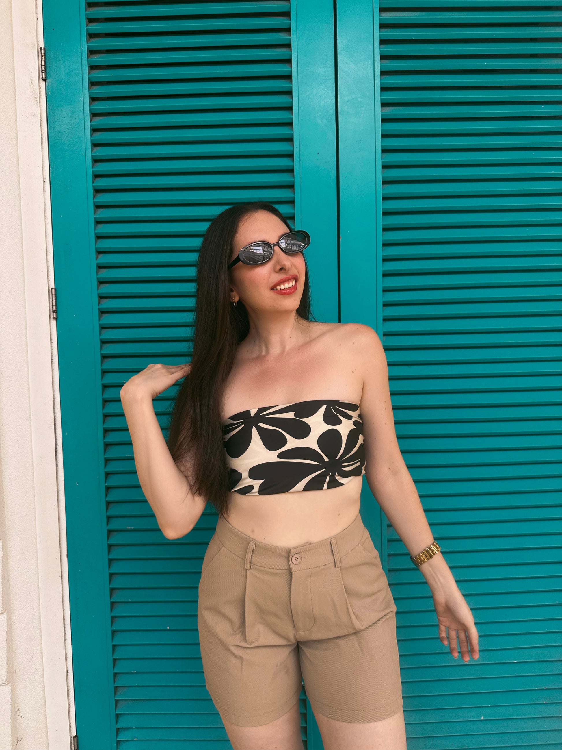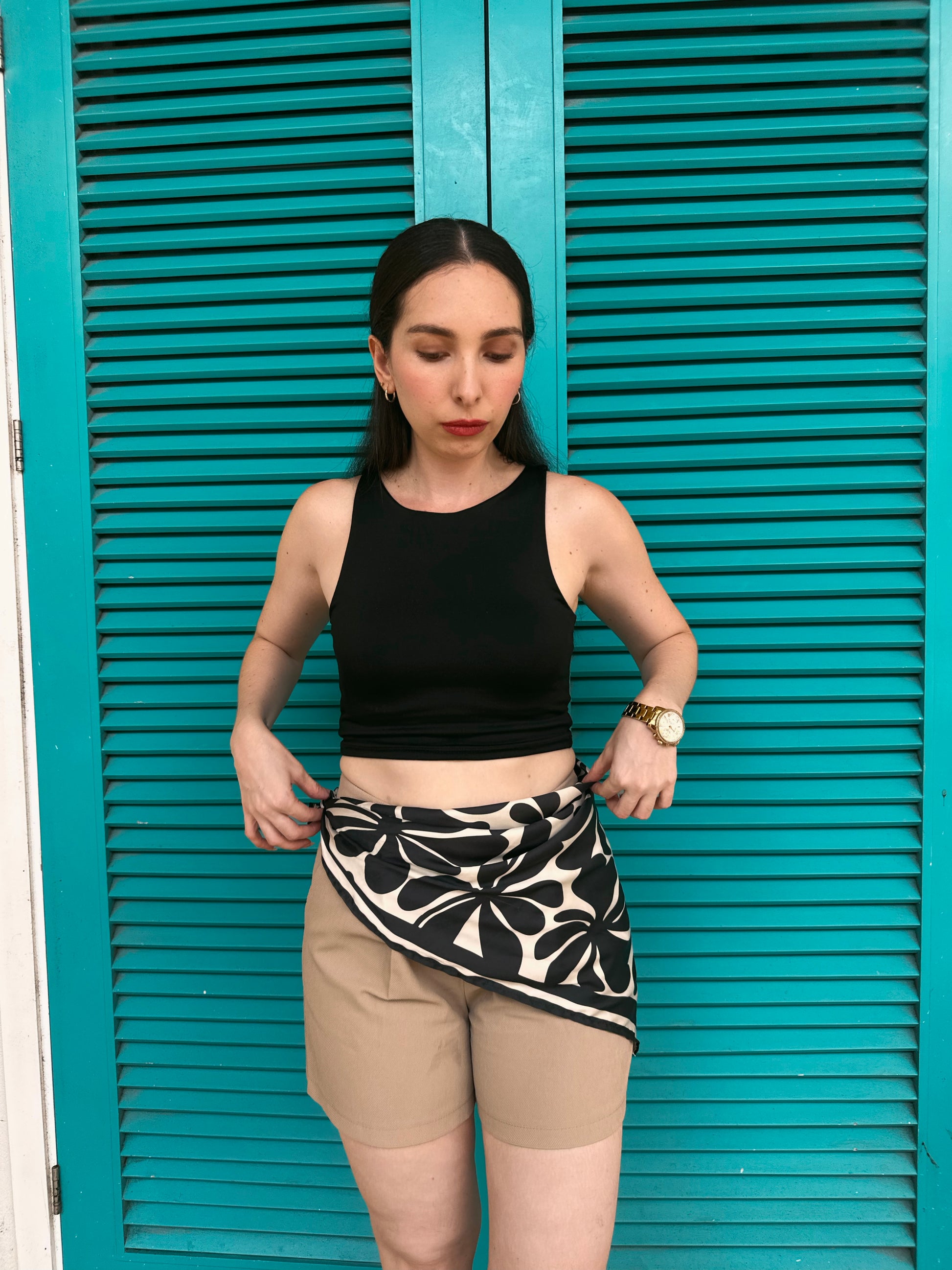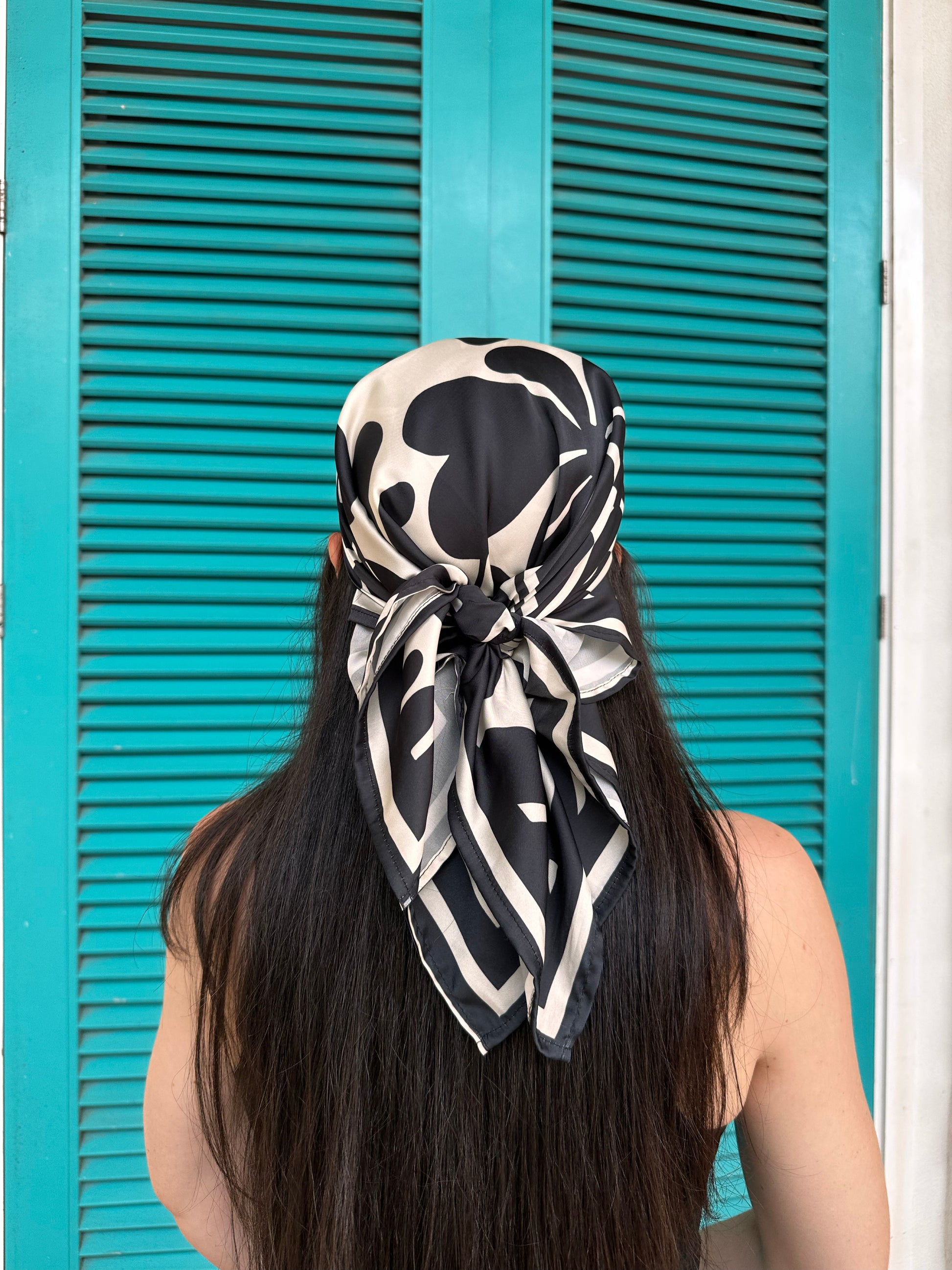 Pañoleta de 70x70 cm en tonos blanco y negro con diseño floral estilizado. Su contraste elegante la hace perfecta para combinar con looks tanto de playa como de ciudad.