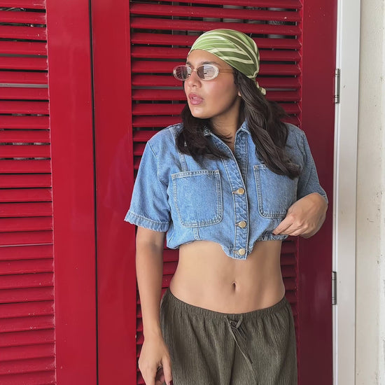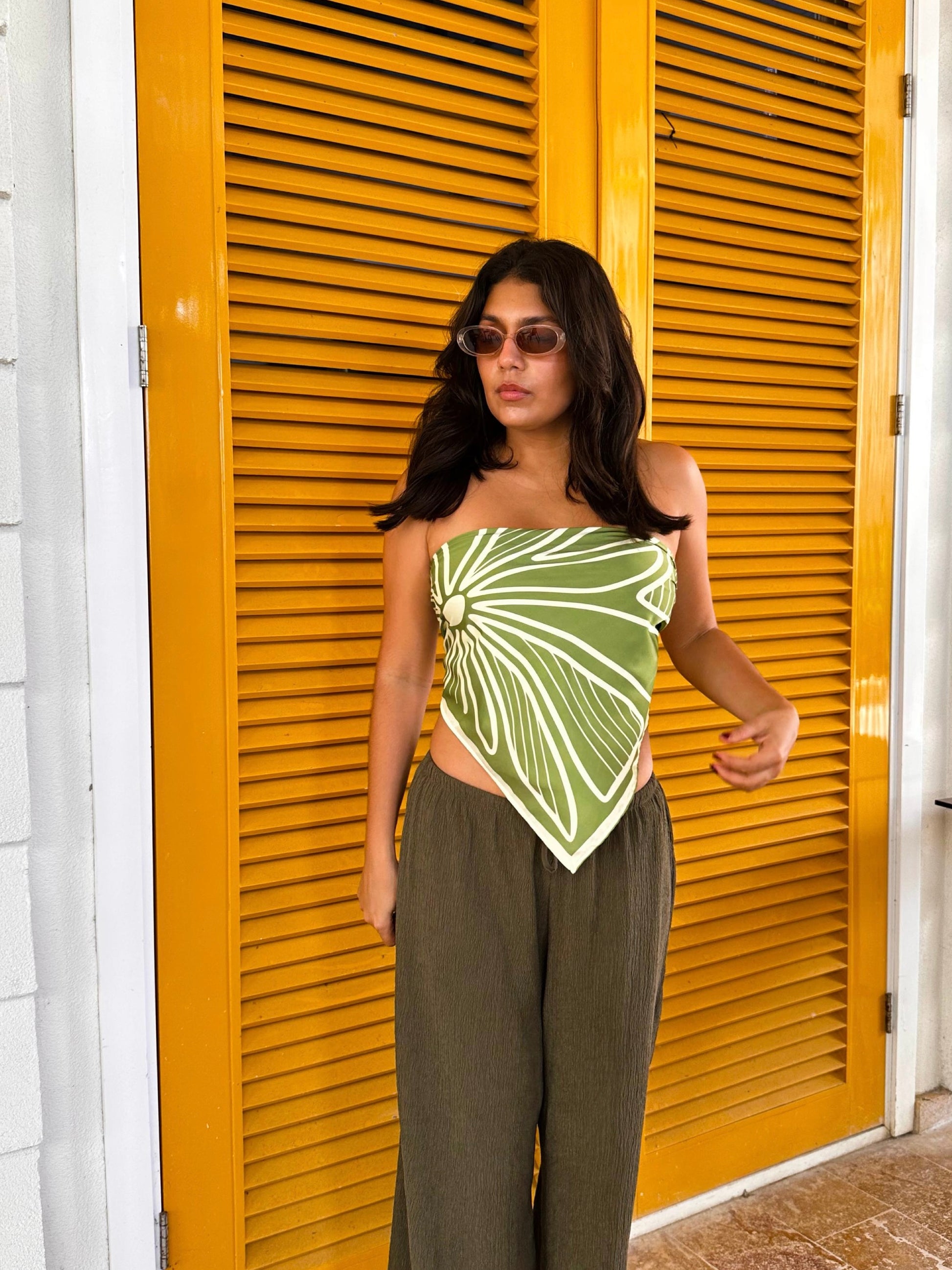 Pañoleta de 70x70 cm en verde con diseño botánico estilizado. Refleja frescura y naturalidad, evocando la calma de la selva tropical