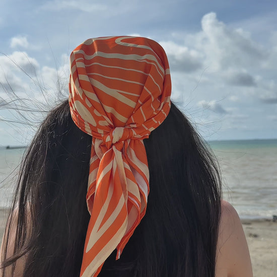 Pañoleta de 70x70 cm en tono naranja intenso con diseño floral inspirado en los rayos del sol. Un accesorio lleno de energía que ilumina tu estilo.